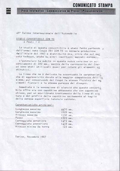 Diese Seite widmet sich dem Ford OSI 20mTS Cabriolet. Das Fahrzeug wurde 1967 anlässlich des Turiner Salons von OSI gebaut. Als Basis diente das Ford OSI 20mTS Coupe (Typ B1), das wiederum auf dem Ford Taunus 20mTS P5 basierte. |