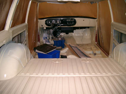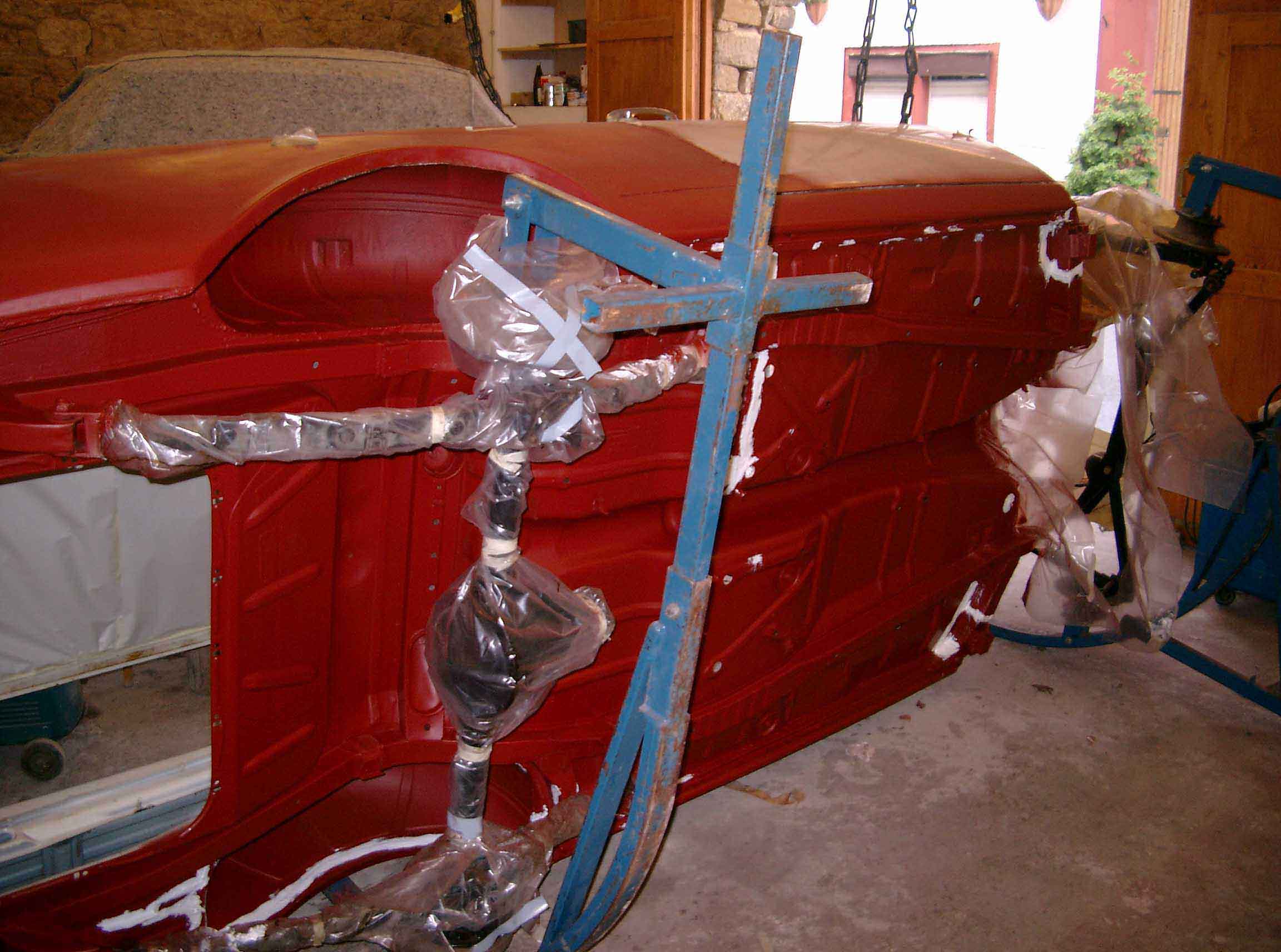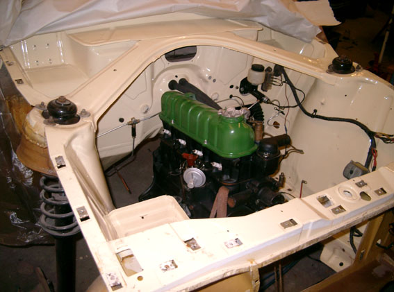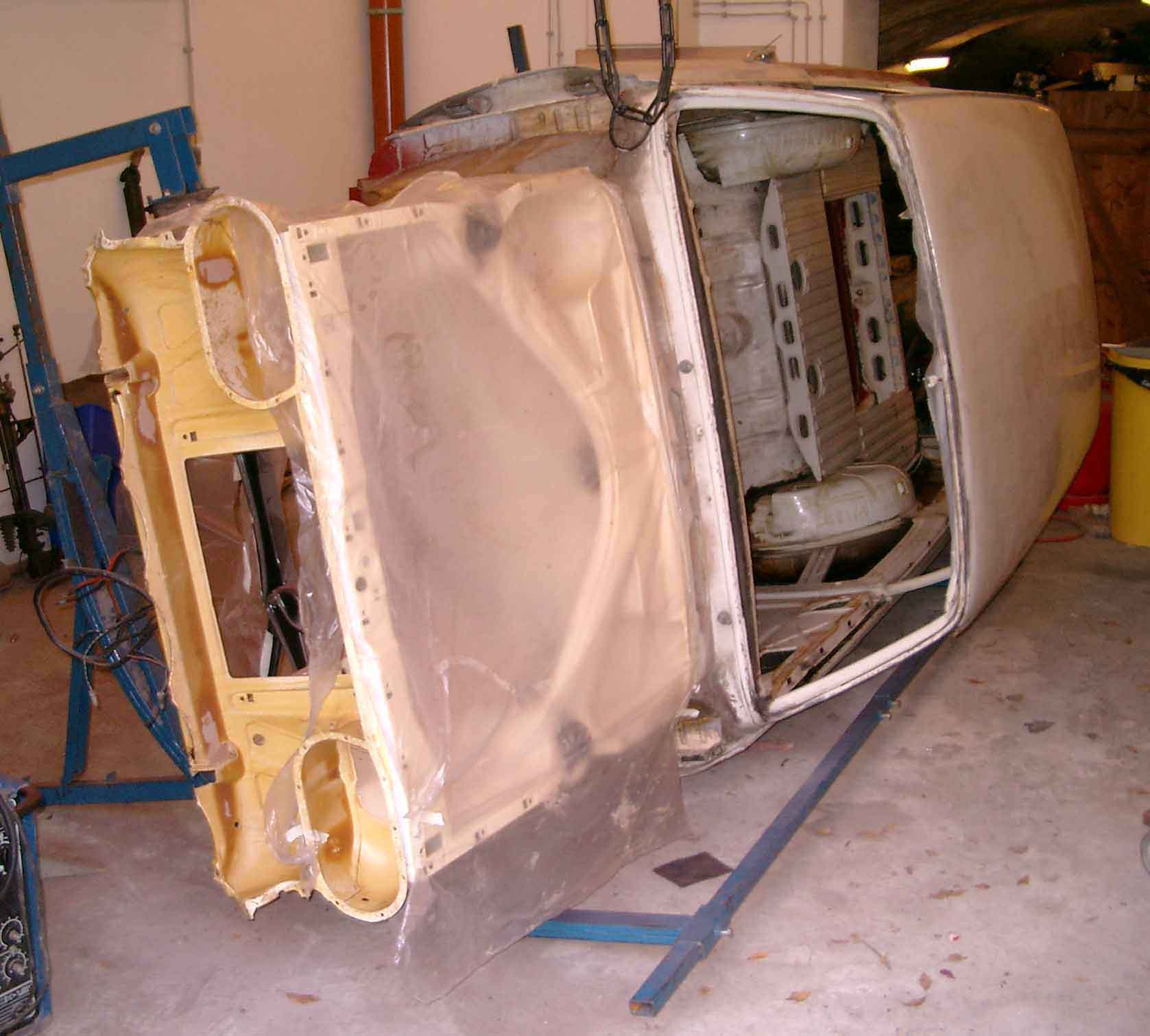Inzwischen mit lackiertem Motorraum. Hier beginnt die Sanierung von Unterboden und Innenraum